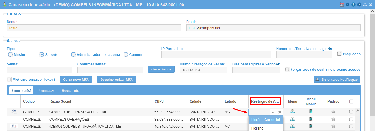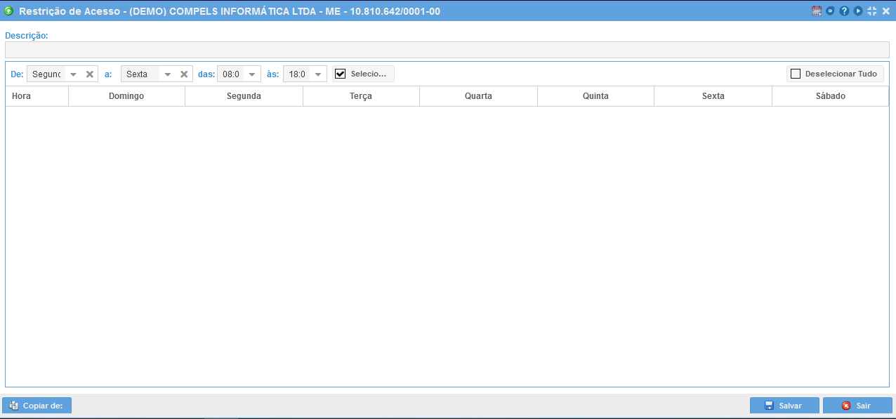 Para que seja possível determinar exatamente em qual horário o sistema estará disponível para uso aos funcionários da empresa, é possível definir restrições de uso através da tabela de horários.