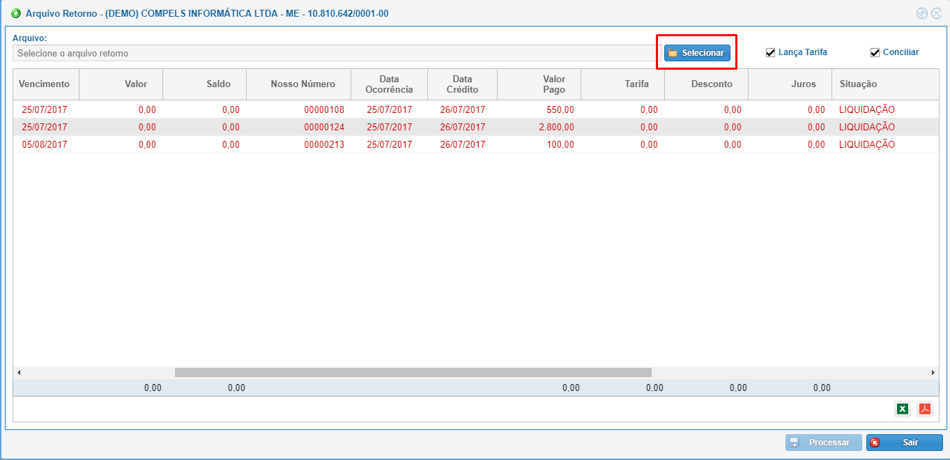 Em seguida selecione o arquivo retorno e verifique a listagem do arquivo mostrada pelo sistema.