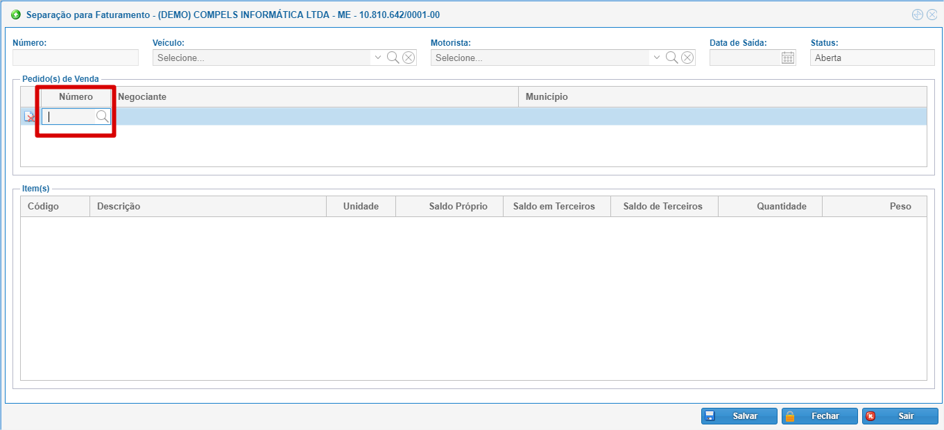 Informe o(s) pedido(s) de venda que deseja separar na tabela "Pedido(s) de Venda" de modo que o(s) item(s) deste(s) apareça(m) na tabela "Item(s)".