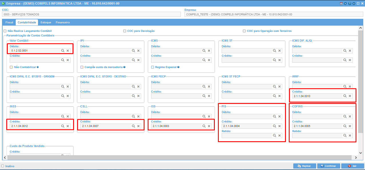 Já no caso da retenção de Pis e Cofins, preencha o campo de conta contábil de PIS/COFINS Retido. Caso este não esteja preenchido, o sistema vai criar as partidas de retenção na conta contábil de crédito