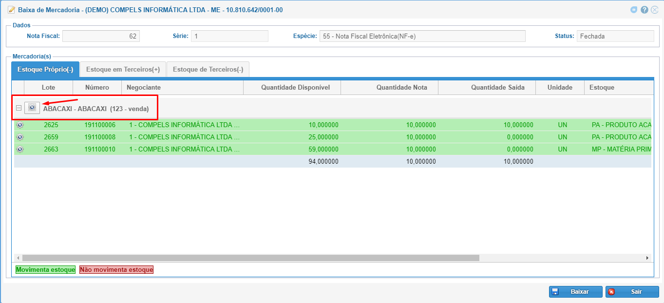 Para vincular os números de séries gerados às baixas (notas de saída), basta acessar a tela de Baixa de Mercadorias, acessar a nota a ser baixada e clicar no ícone de engrenagem para ordenar os números de série.