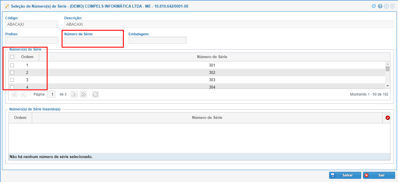 Nº Série Avulso: Campo para inserir o número de série manualmente ou com um leitor óptico.