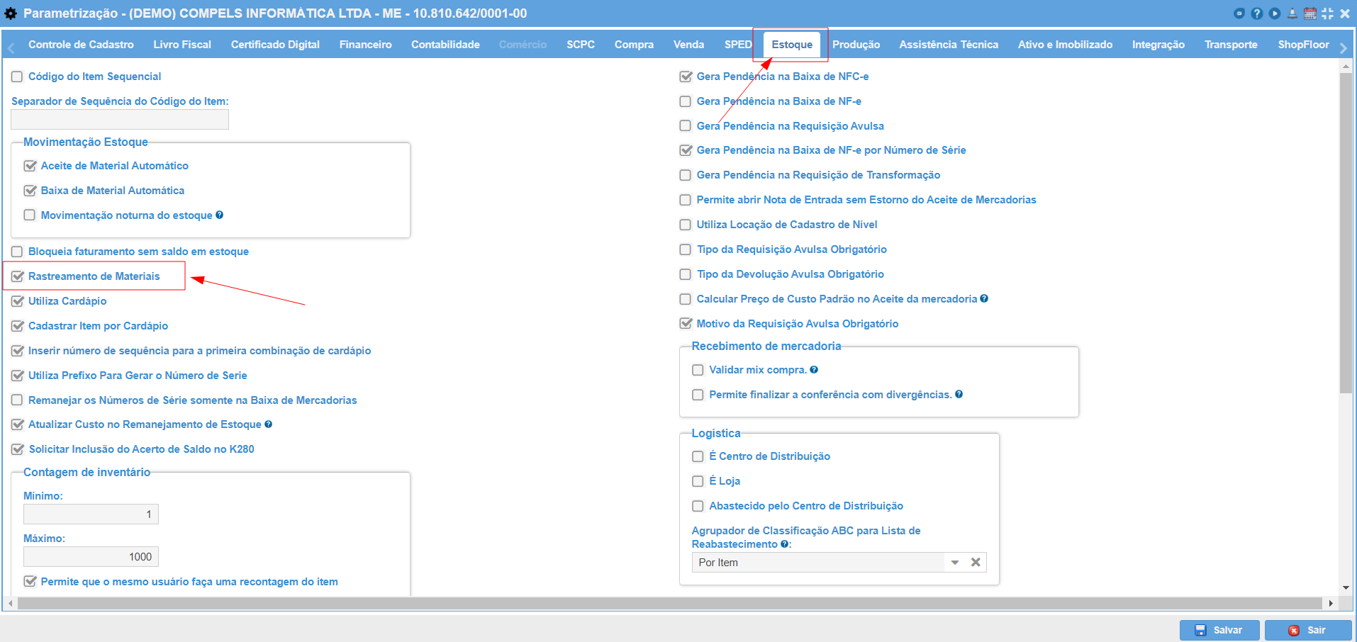 1 - Parametrização: Marcar a opção "Rastreamento de Materiais" na aba de ESTOQUE..