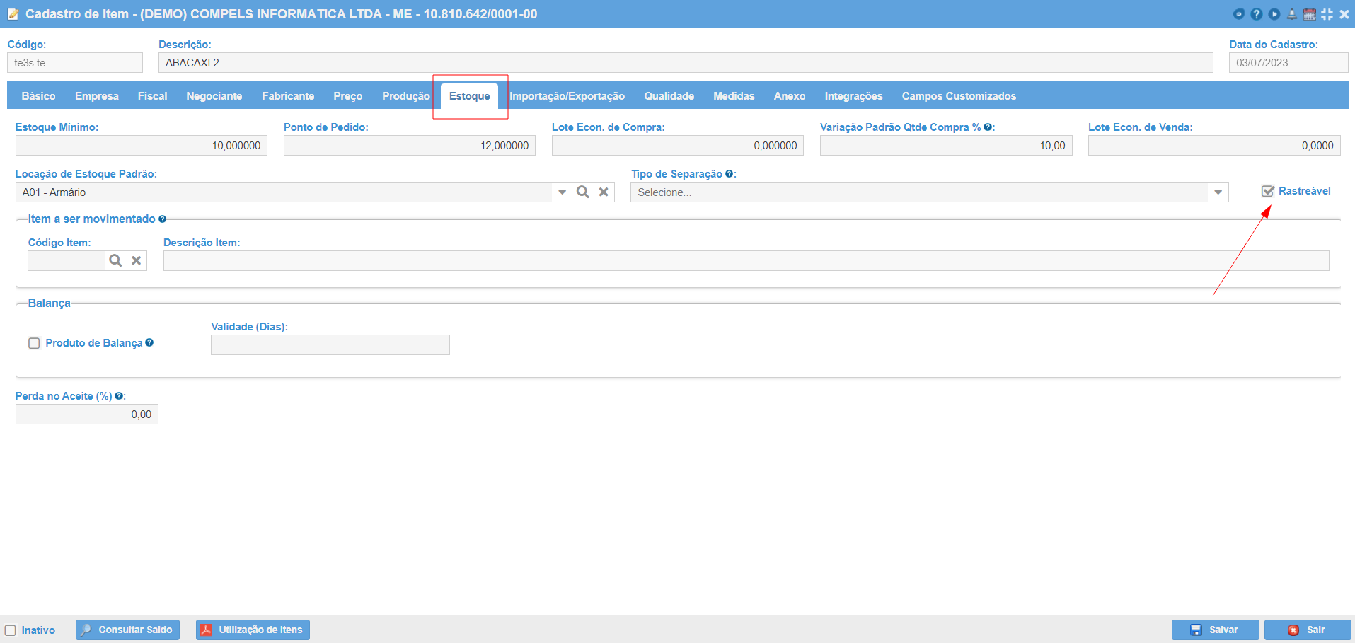 2 - Cadastro do item: Marcar a opção "Rastreável" para os itens que terão os números de série vinculados. Uma vez rastreável, será obrigatório informar números de série na Baixa de Mercadorias (Nota Fiscal de Saída) do Item em questão. Nos casos de utilização da estação de Integração do ShopFloor, tanto matérias-primas a serem integradas quanto produto devem ser marcados como rastreável.