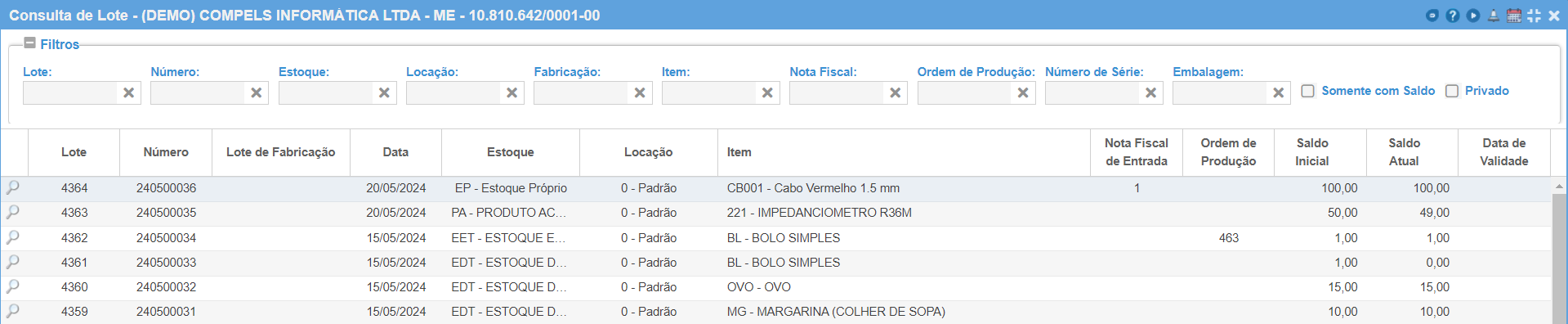 É possível filtrar por exemplo, por Nota Fiscal de Entrada ou Ordem de Produção que gerou o Lote.