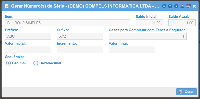 Para inserir números de série automaticamente, basta clicar no botão "Gerar", colocar Prefixo (se quiser), Sufixo (se quiser), Valor inicial (valor onde iniciará o número de série), Incremento (valor que será incrementado) e a sequência (Decimal ou Hexadecimal).