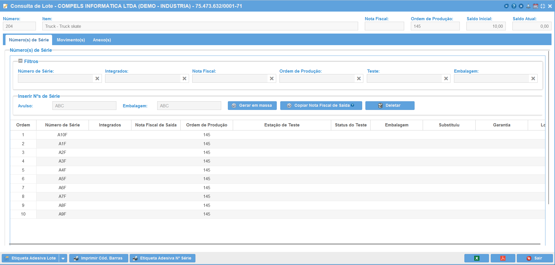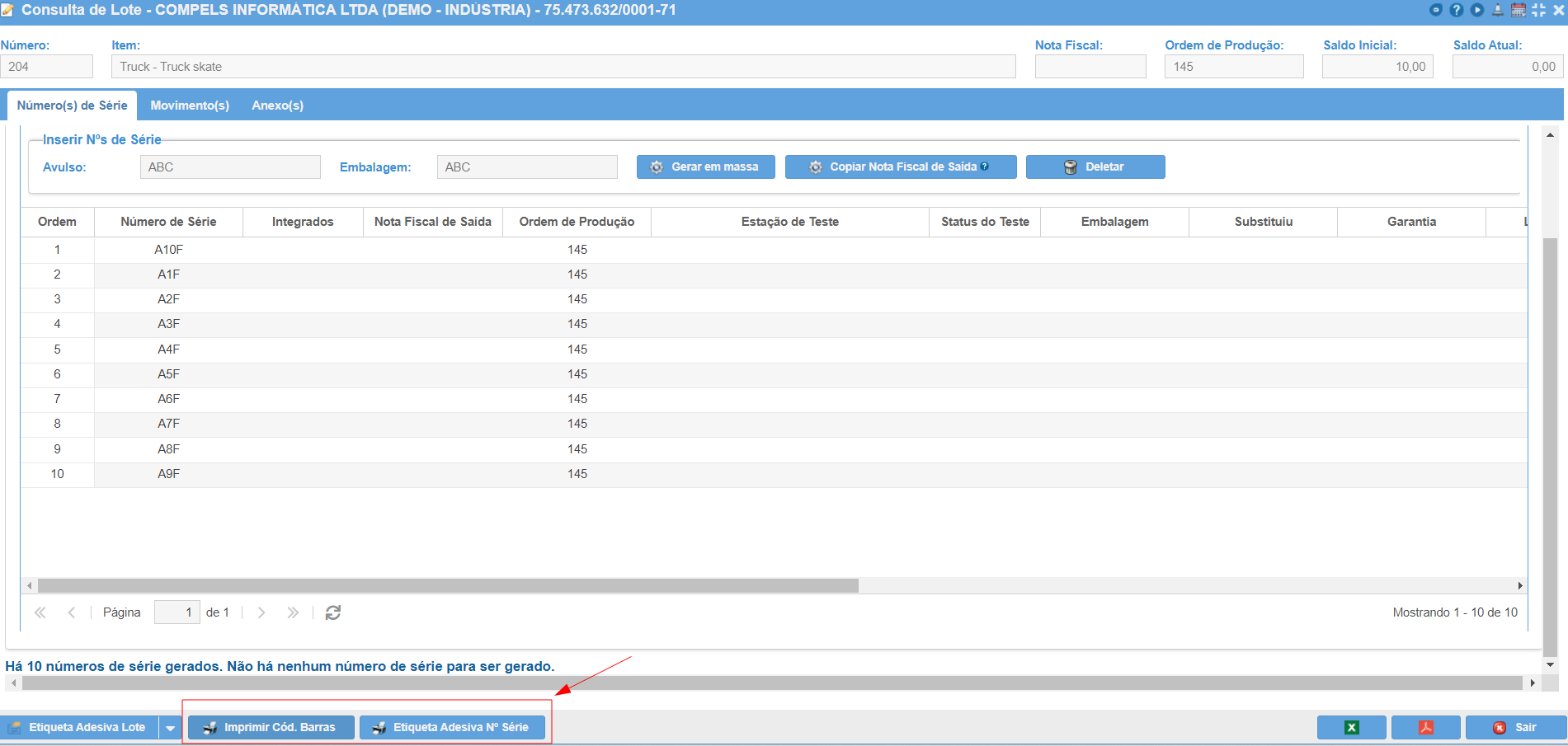 Para a impressão das etiquetas dos números de série clique em Imprimir Còdigo de Barras ou Etiqueta Adesiva Nº de Série. O ERP vai exportar um arquivo em PDF o qual deverá ser enviado para a impressora.