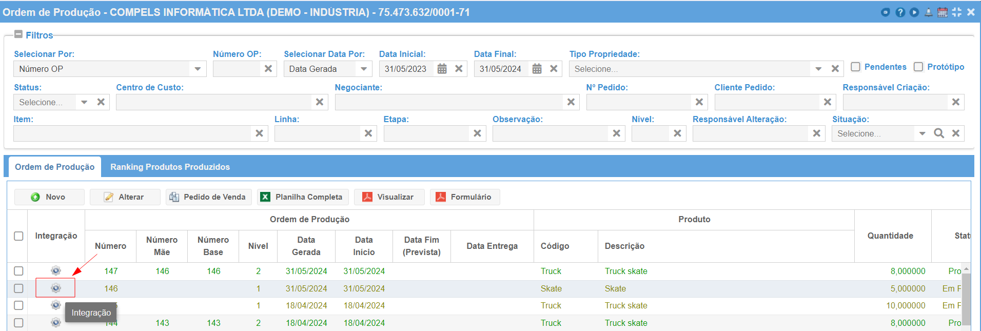 A coluna Integração deixa visível o botão de configuração para produtos/subprodutos rastreáveis. O acesso é permitido desde que na rota a estação de integração esteja selecionada.