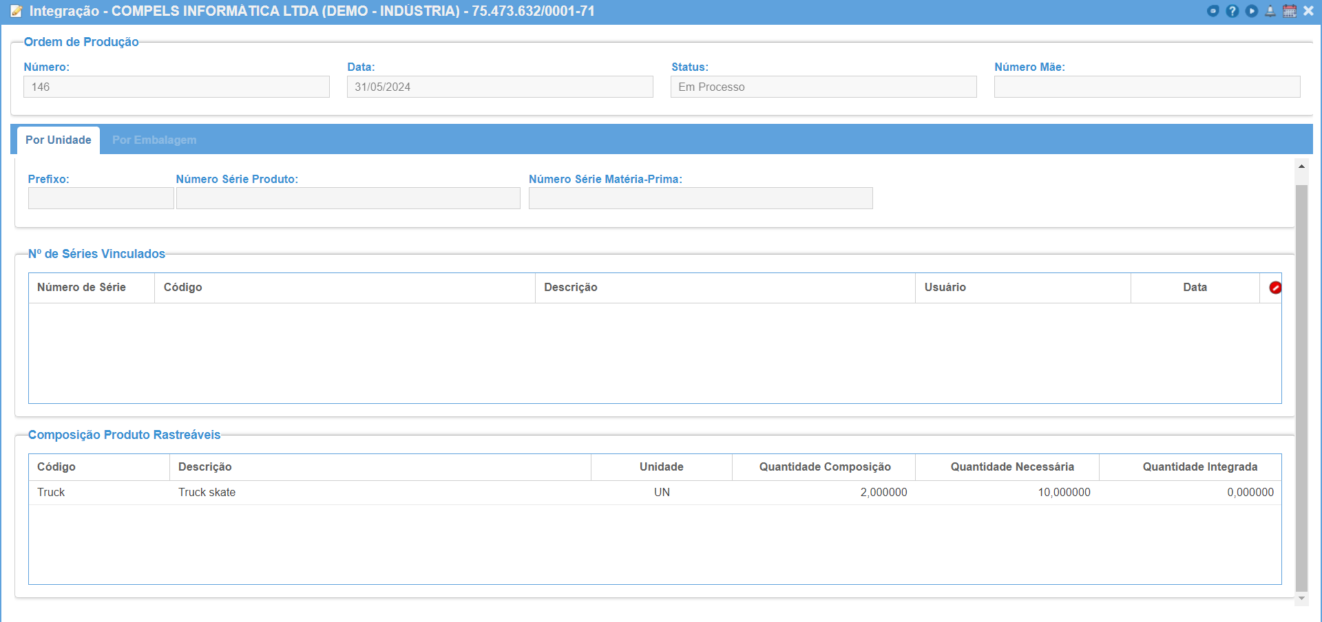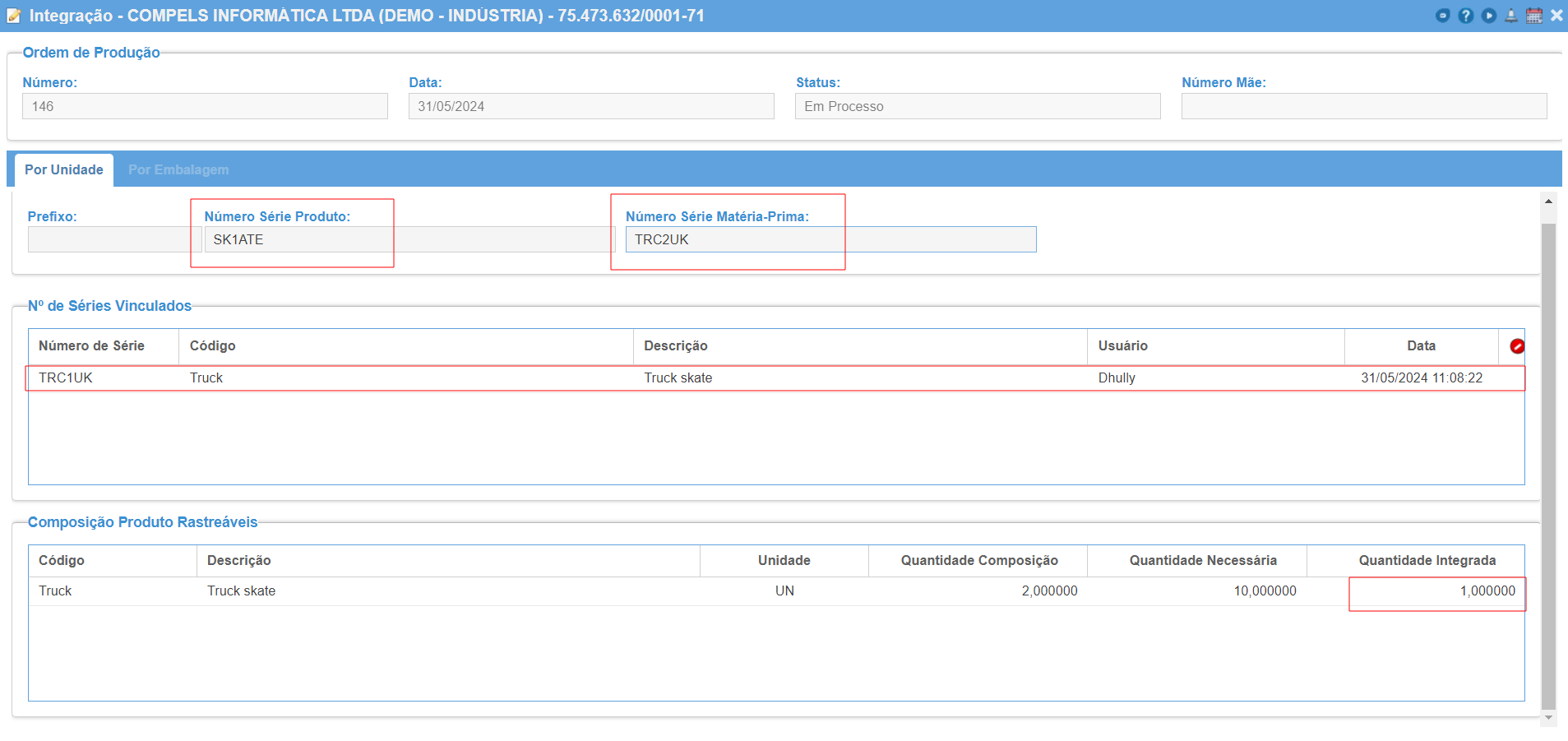 Na integração, será informado o número de série do produto e posteriormente o número de série da matéria-prima que será vinculada ao mesmo. A quantidade de vínculos permitidos será a quantidade da composição. Um mesmo número de série não pode ser vinculado com mais de um produto. Além disso, o item da MP precisar ser rastreável em seu cadastro de item.