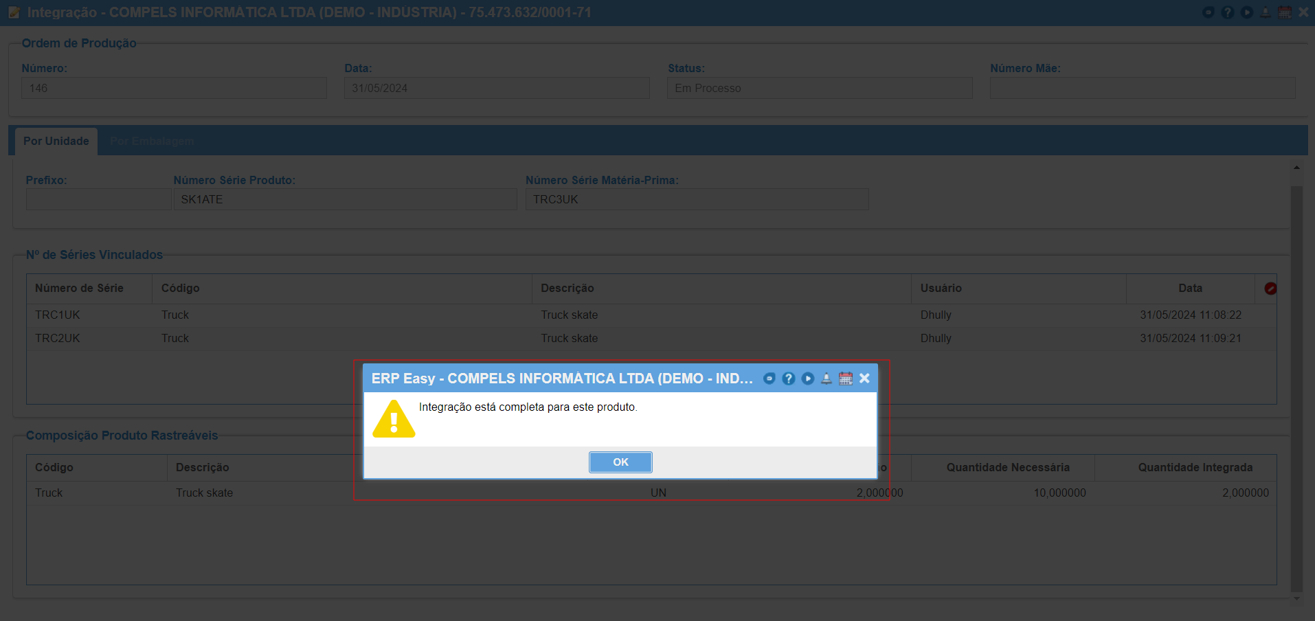 As duas MPs já foram integradas, caso tenta integrar a terceira informa que a quantidade de integração já está compelta para o Número de Série do Produto Acabado.