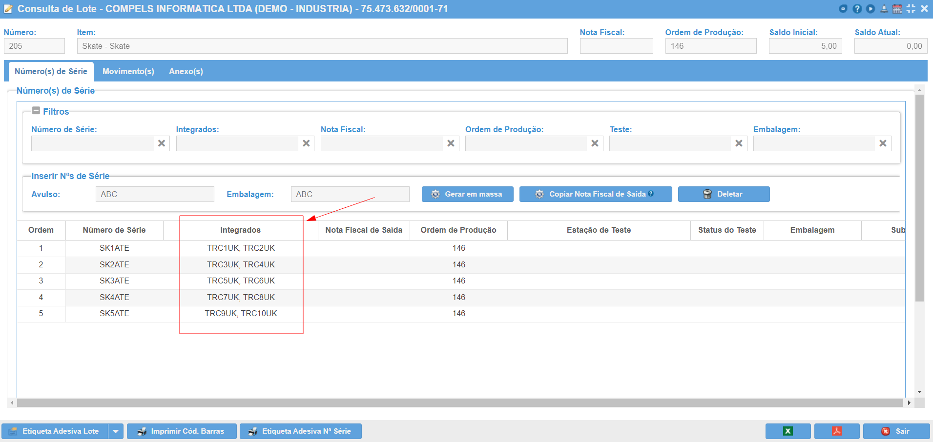 Os Números de Série integrados podem ser verificados na Consulta de Lote da OP.