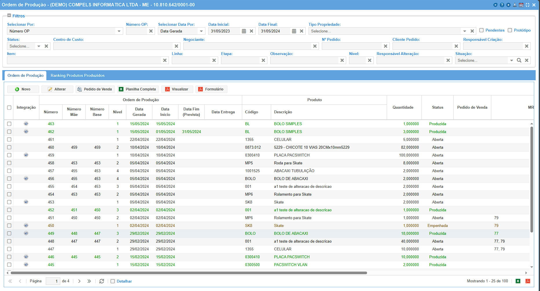 - Produzida: são as OPs que já foram produzidas/finalizadas. Toda a matéria-prima já foi consumida do estoque e criou-se saldo do Produto Acabado.