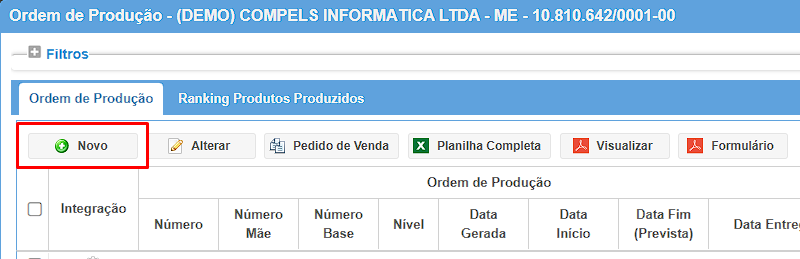 Para cadastrar uma Ordem de Produção clique no botão NOVO ou no botão Pedido de Venda (clique aqui para o manual de Ordem de Produto por Pedido de Venda).