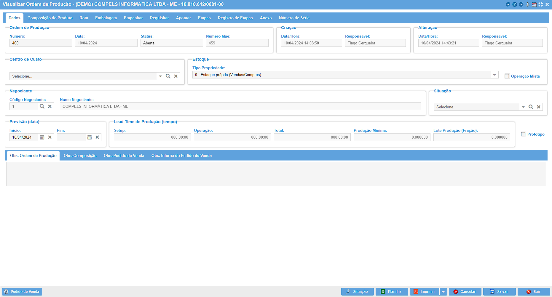 - Dados da Ordem de Produção: são campos de preenchimento automático do sistema (Número, Data, Status e Número Mãe).