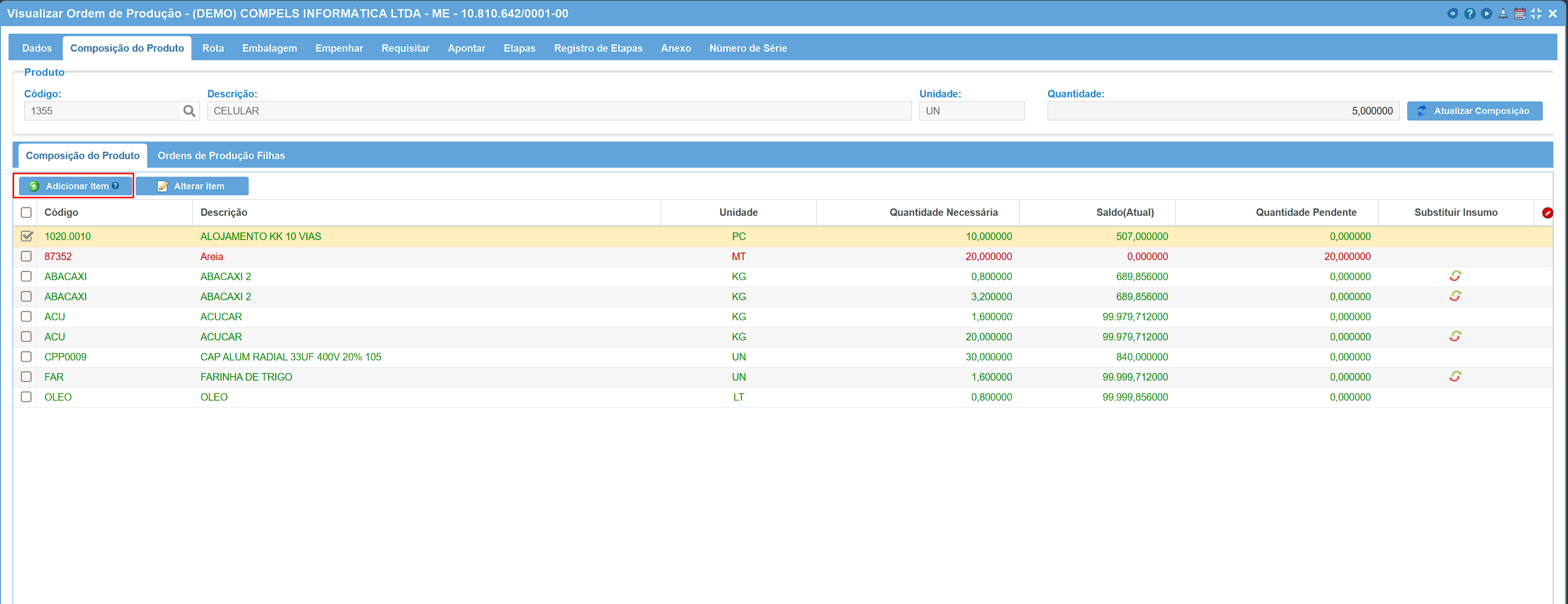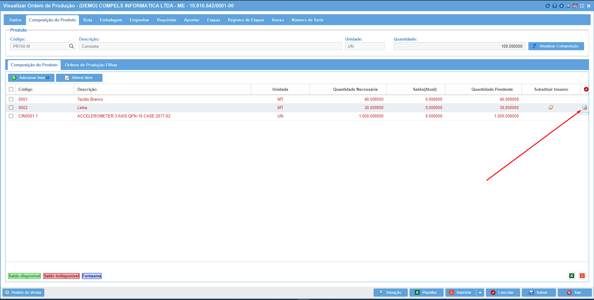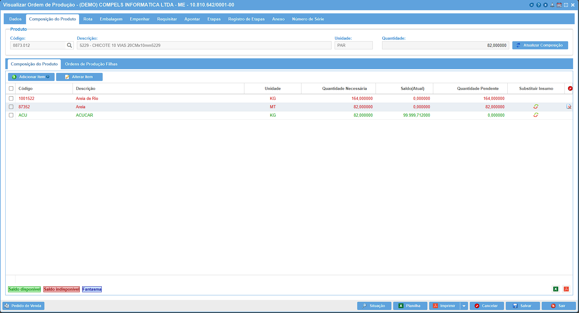 Ao inserir o código do produto que a OP irá produzir, é possível visualizar se as matérias-primas necessárias possuem saldo em estoque (verde) ou não (vermelho). Neste momento também é possível escolher se alguma matéria-prima será editada ou excluída da composição dentro da ordem ou ainda se será adicionado um novo material manualmente que não existe dentro da composição vinculada à OP. É importante ressaltar que quaisquer modificações manuais que ocorram nessa aba composição dentro da ordem não irão afetar o cadastro da composição do produto vinculada anteriormente na subseção "produto" dessa mesma aba, sejam elas alterações de quantidades, adição, exclusão de materiais ou mesmo substituição de insumos. As alterações são restringidas apenas para a OP em questão, e a composição permanece inalterada.