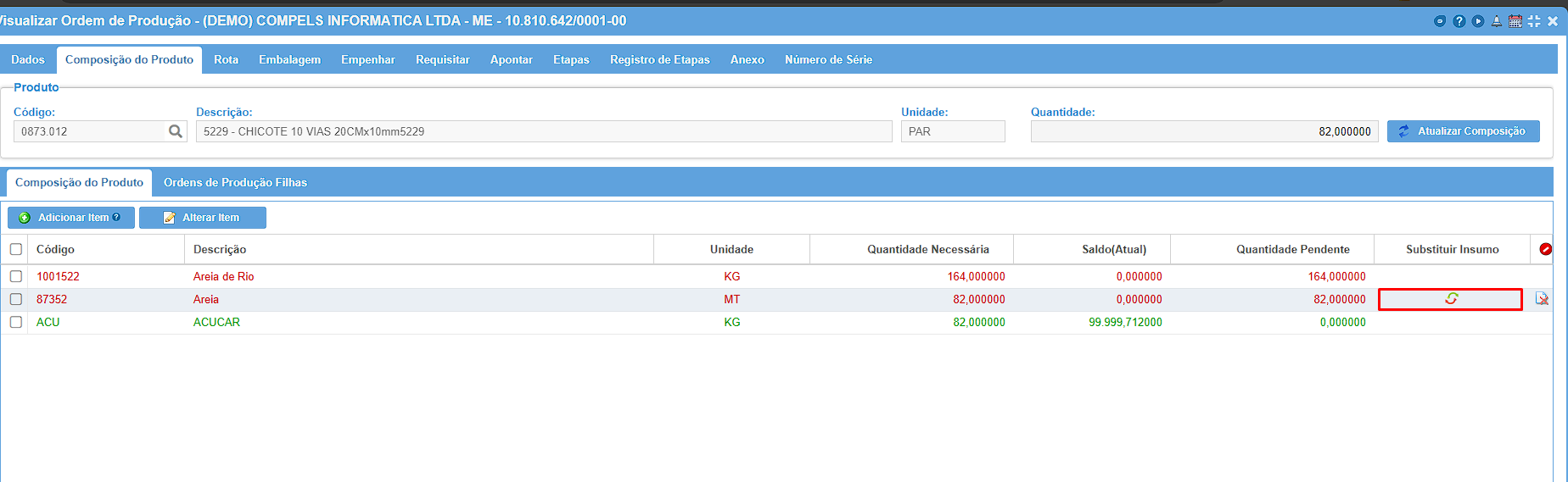 Se necessário, é possível substituir a matéria-prima por outra. Para isso, clique no ícone na coluna de "Substituir Insumo".