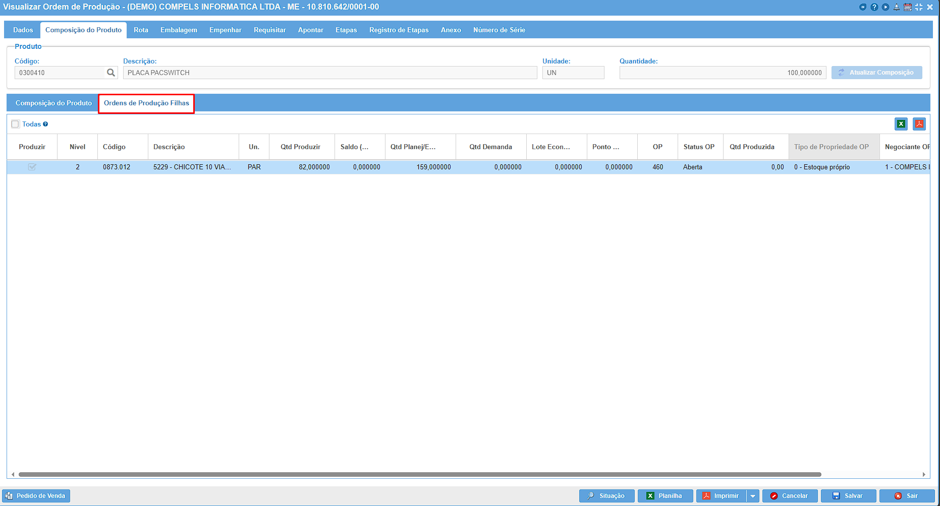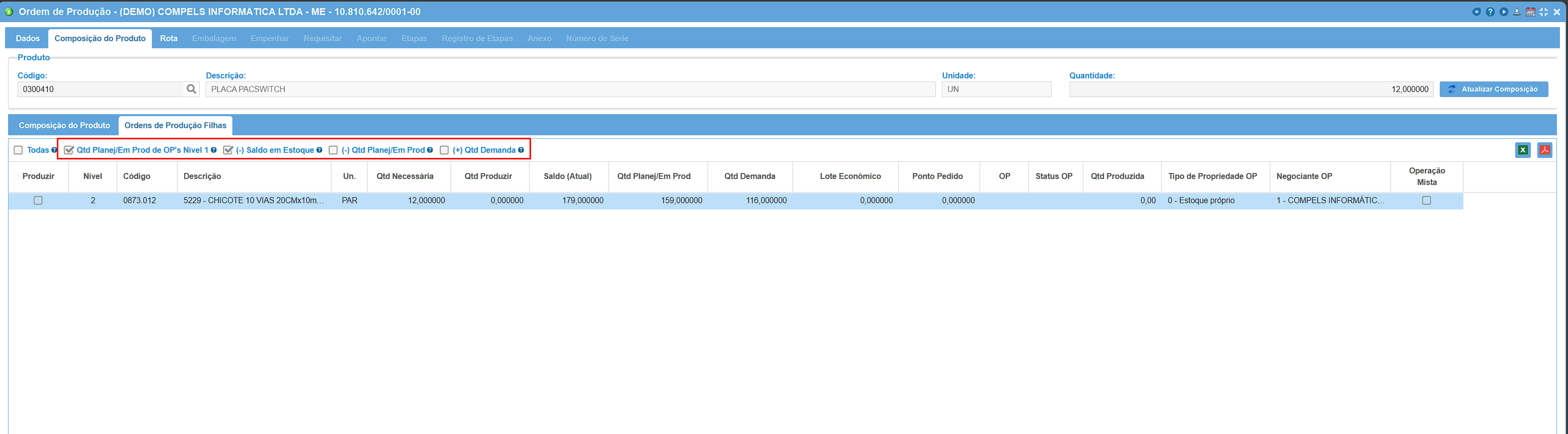 Na aba de OPs filhas são listados por nível todos os subprodutos, ou seja, item da estrutura do produto principal que também possuem estrutura, e assim por diante.