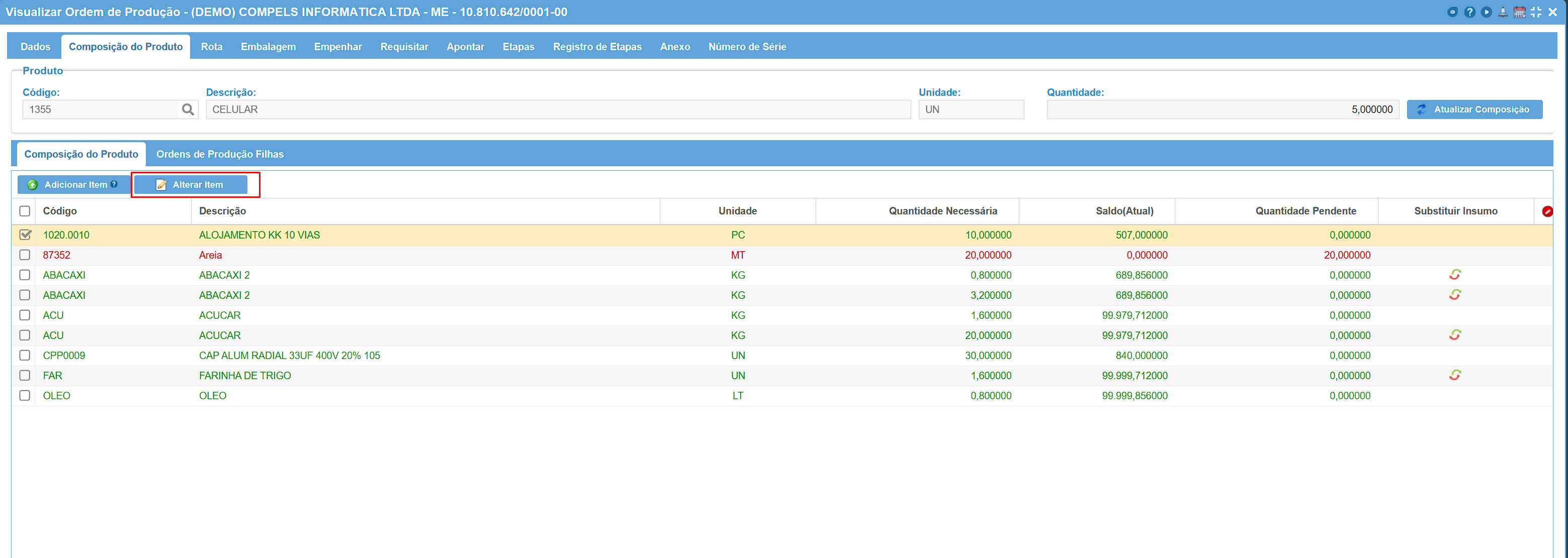 Para editar um item da composição, dê dois cliques em cima de um dos itens ou clique no botão "Alterar item".
