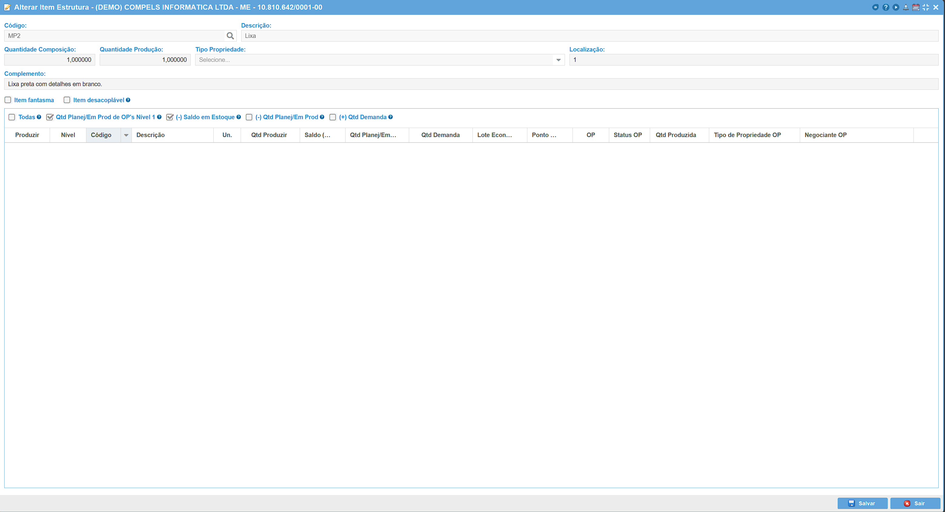 Dentro da tela de alteração é possível alterar diversas informações do item da estrutura ou composição: