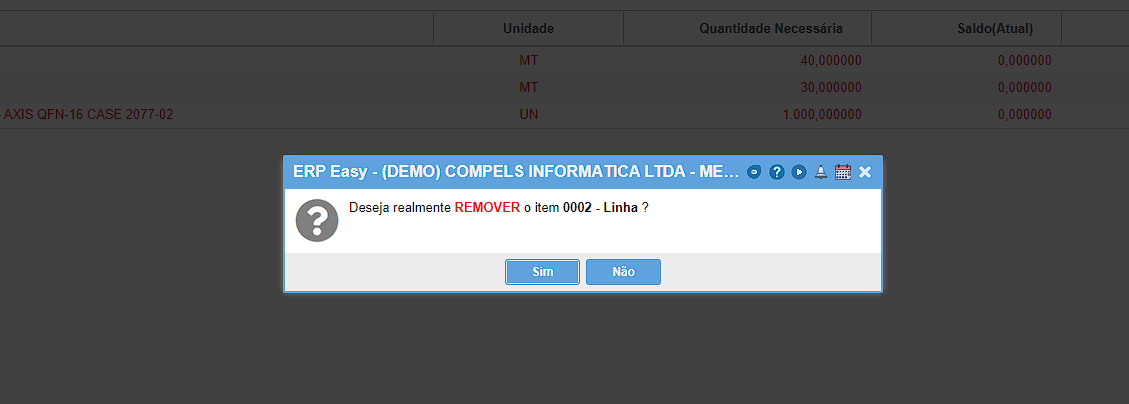 Para excluir um insumo da estrutura na OP, basta selecionar o ícone na direita da grid e confirmar.