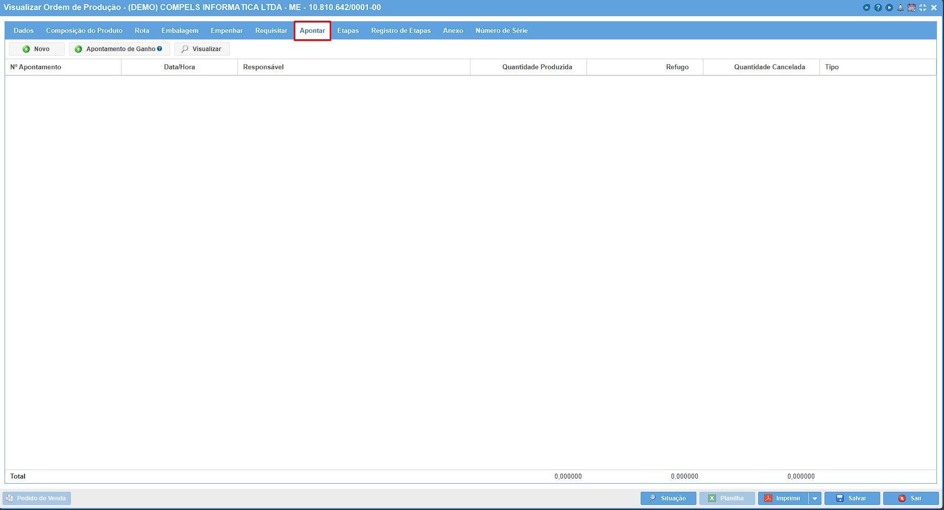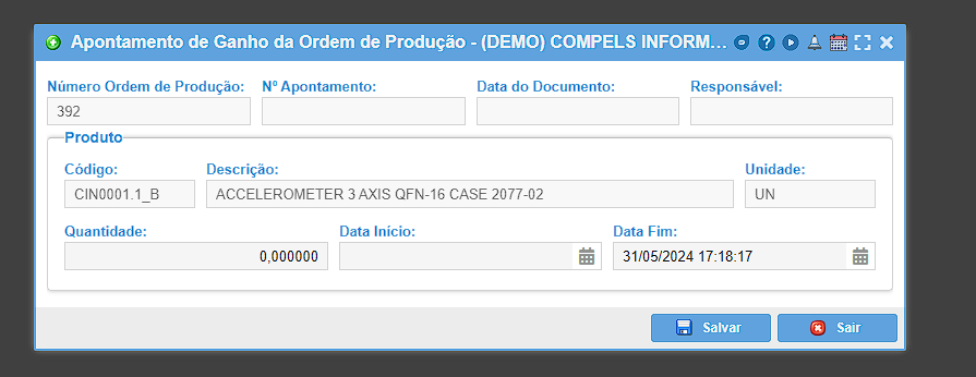É possível ainda realizar um apontamento de ganho, isso é, quando existe um apontamento produzido a mais que o previsto na Composição de Produtos. Basta clicar no botão "apontamento de ganho" para criar um novo.