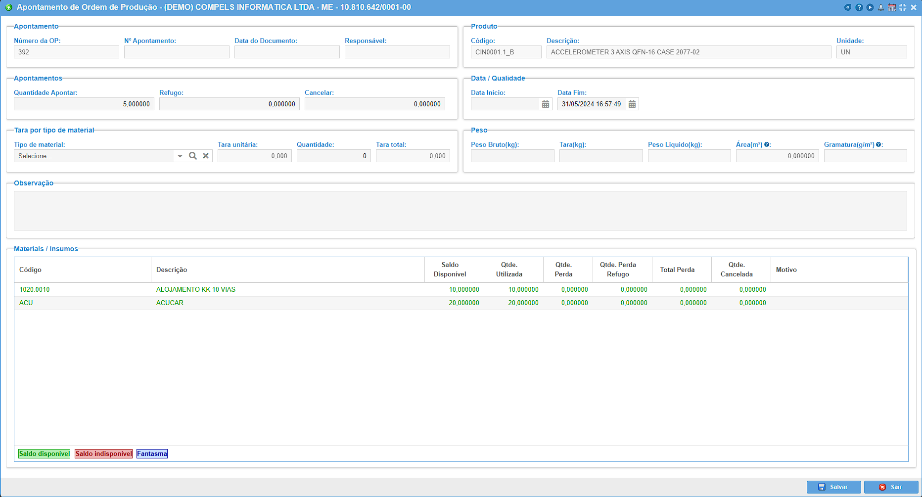 Data início e Data fim: Data obrigatória para indicar o apontamento. Neste caso esta data é utilizada para relatórios de CMV e registros fiscais (Bloco K).