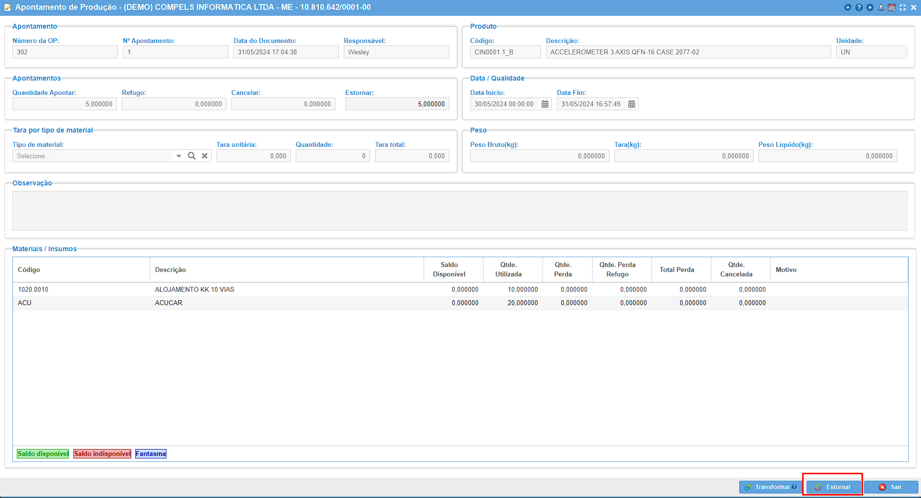 Cancelar: Cancela determinada quantidade. Por exemplo, gerei 100, produzi 90 e quero cancelar 10. Para cancelar, esta quantidade não deve ter sido requisitada.