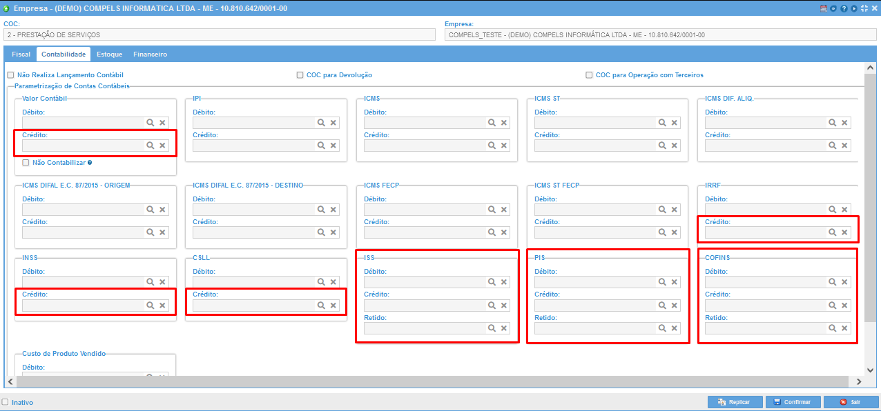 Preencha apenas contas que participam da operação, como exemplo, uma prestação de serviço não possui ICMS, portanto não é necessário preencher este campo.