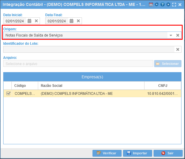 Para realiza a Integração de Notas Fiscais de Saída de Serviços, selecione a seguinte origem: