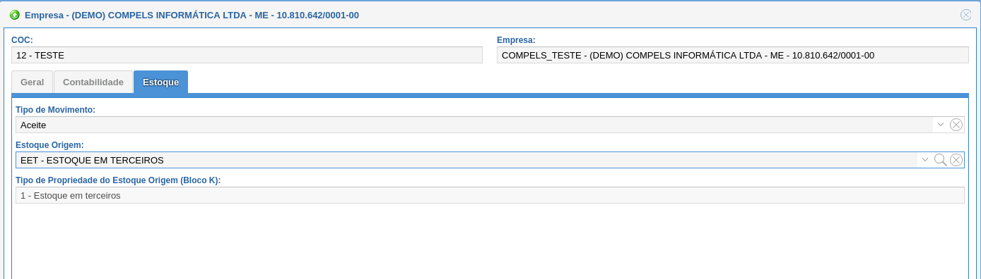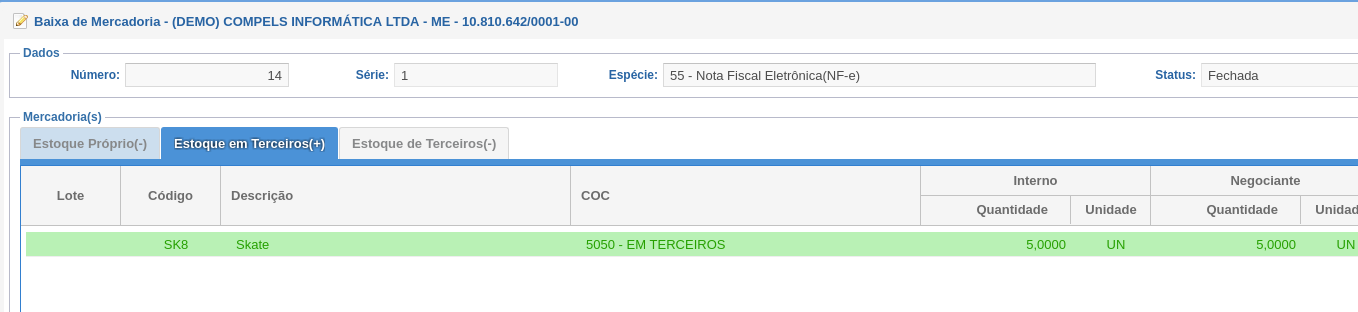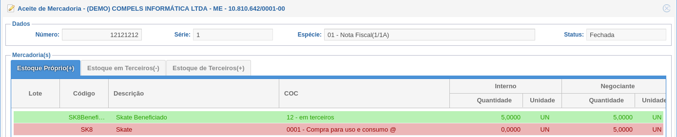 Note que o COC do SK8 Beneficiado será um COC "Em Terceiros" que movimenta o estoque. Ou seja, irá subtrair a quantidade em nota do "Estoque em Terceiros" e adicionará esta quantidade no "Estoque Próprio".