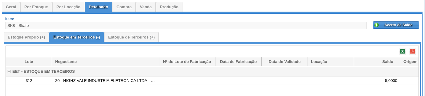 - Estoque Em Terceiros: Saldo da quantidade em nota que será adicionado no "Estoque em Terceiros" (+).