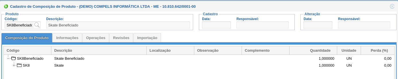 Feito a baixa, temos que ter em nossa composição o produto beneficiado, conforme exemplo abaixo.