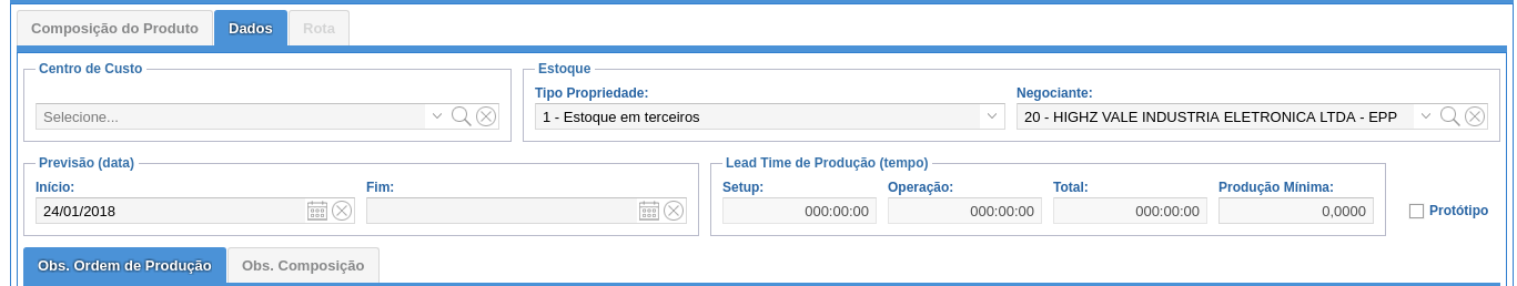 Configurado a composição, iremos gerar uma Ordem de Produção "Em Terceiros". Na aba DADOS, é necessário escolher o "Tipo de Propriedade" e o Negociante. O Negociante é de suma importância para o consumo do "Saldo em Terceiros", pois o lote criado na baixa de material está vinculado a este Negociante.