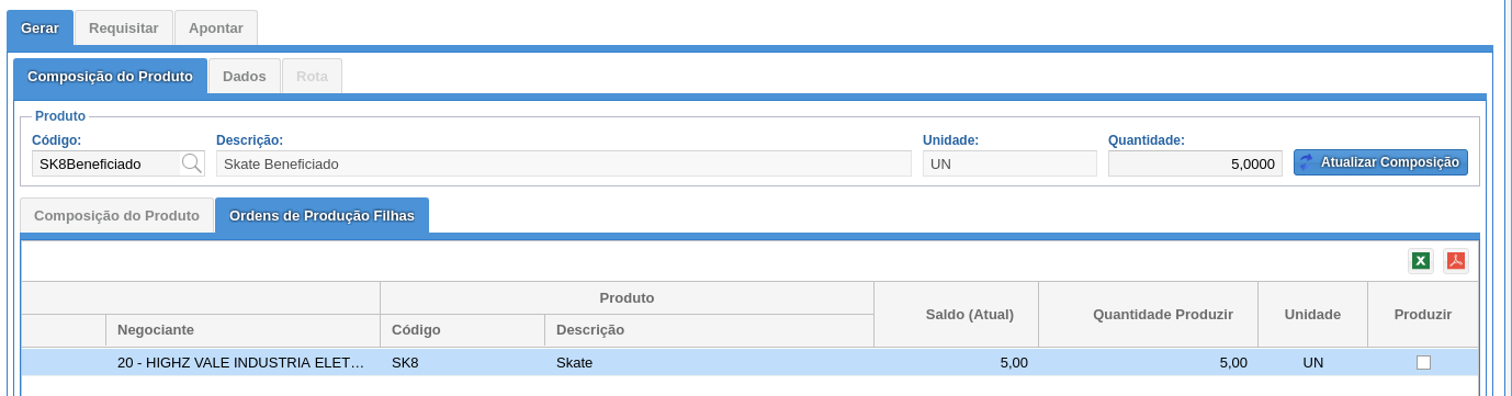Gerada a Ordem de Produção, será permitido requisitar o SK8, que está na composição do SK8 beneficiado, do "Estoque em Terceiros".