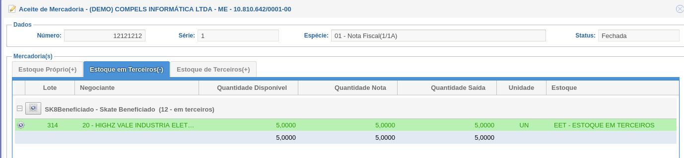 - Estoque Próprio: Saldo da quantidade em nota que será subtraído do "Estoque Próprio"(-).