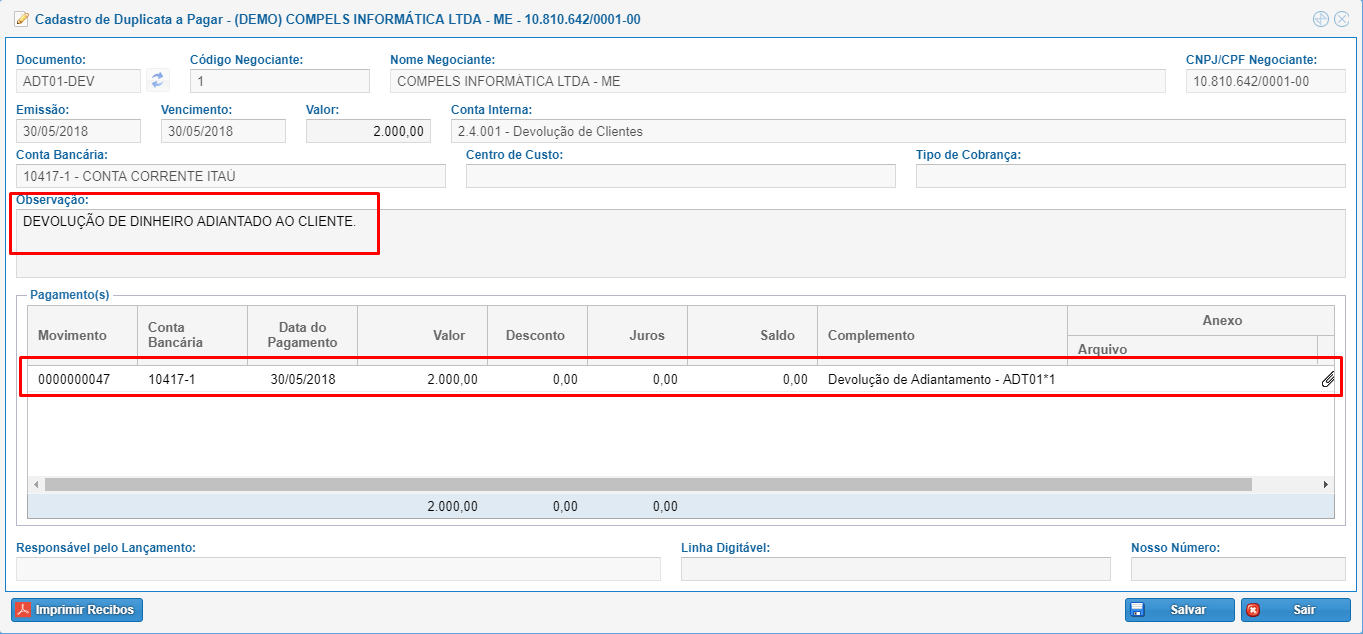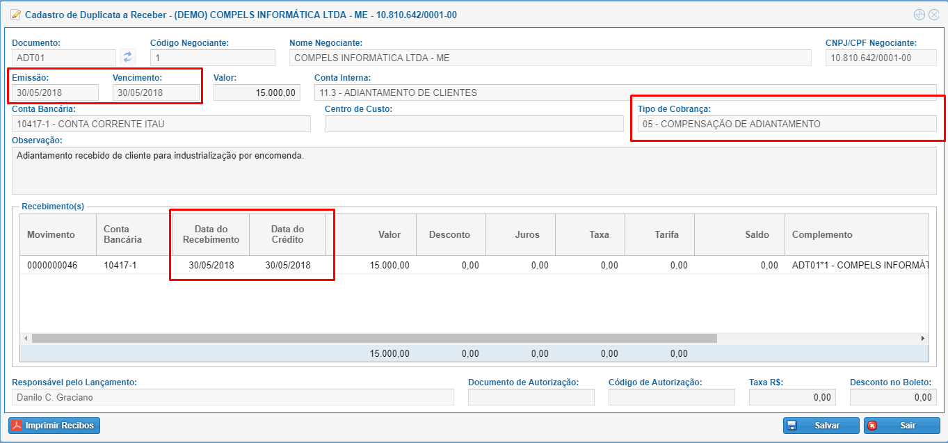 Conforme os destaques na imagem acima, note que a data de emissão, vencimento, recebimento e crédito devem ser as mesmas, e também que o campo tipo de cobrança deve ser lançado com o código 05 - COMPENSAÇÃO DE ADIANTAMENTO.