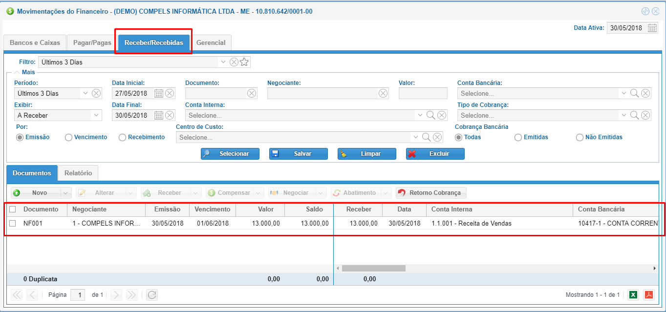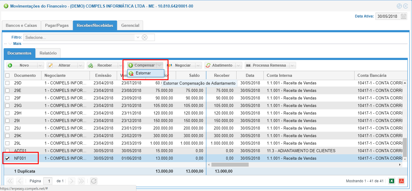 Depois da duplicata referente à nota de saída ser lançada no financeiro (imagem acima), devemos realizar a compensação deste documento com o valor já recebido. Note que o valor da duplicata é de R$13.000,00 mas o valor adiantado é de R$15.000,00 e isso não tem problema algum.