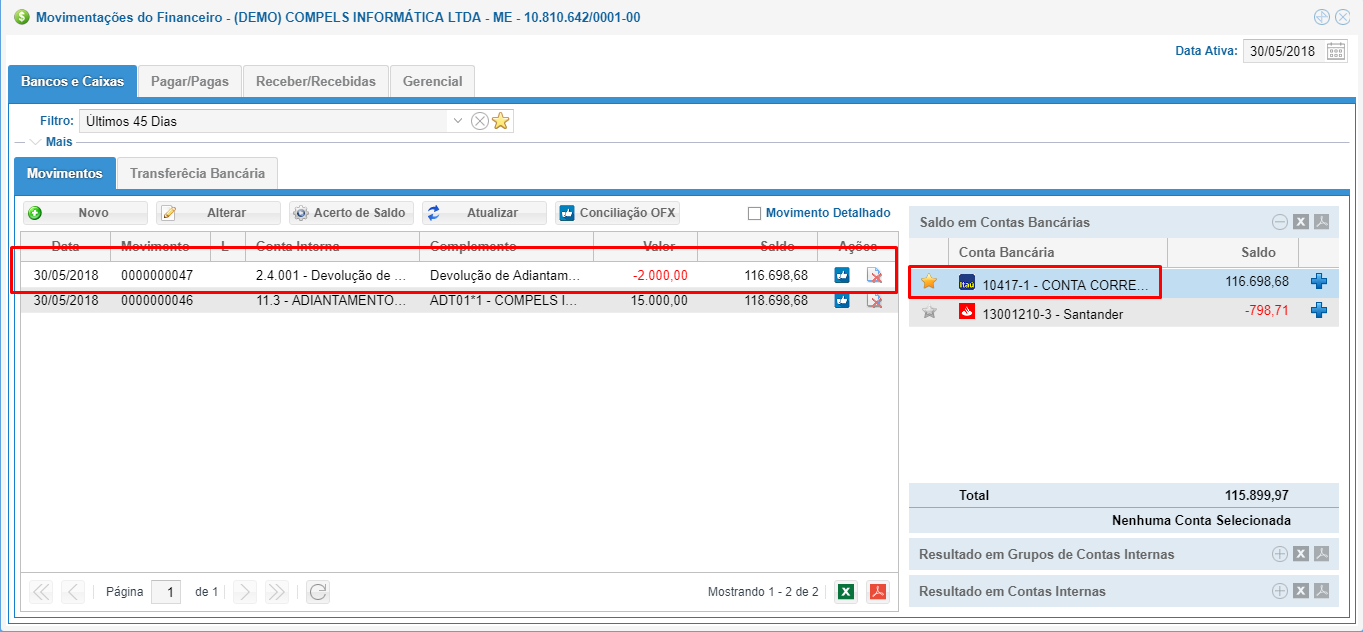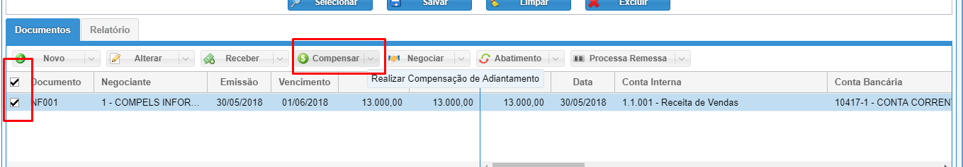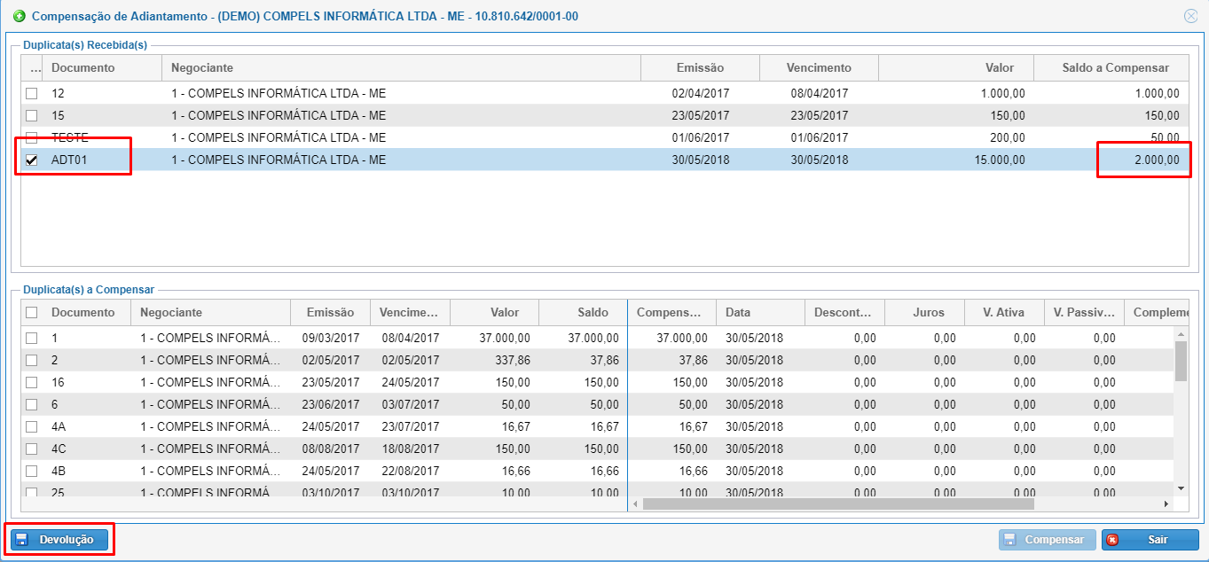 E em nosso exemplo, temos uma sobra de R$ 2.000,00, esta que iremos devolver ao cliente. Para isso, selecione a duplicata que foi adiantada e clique novamente em compensar.