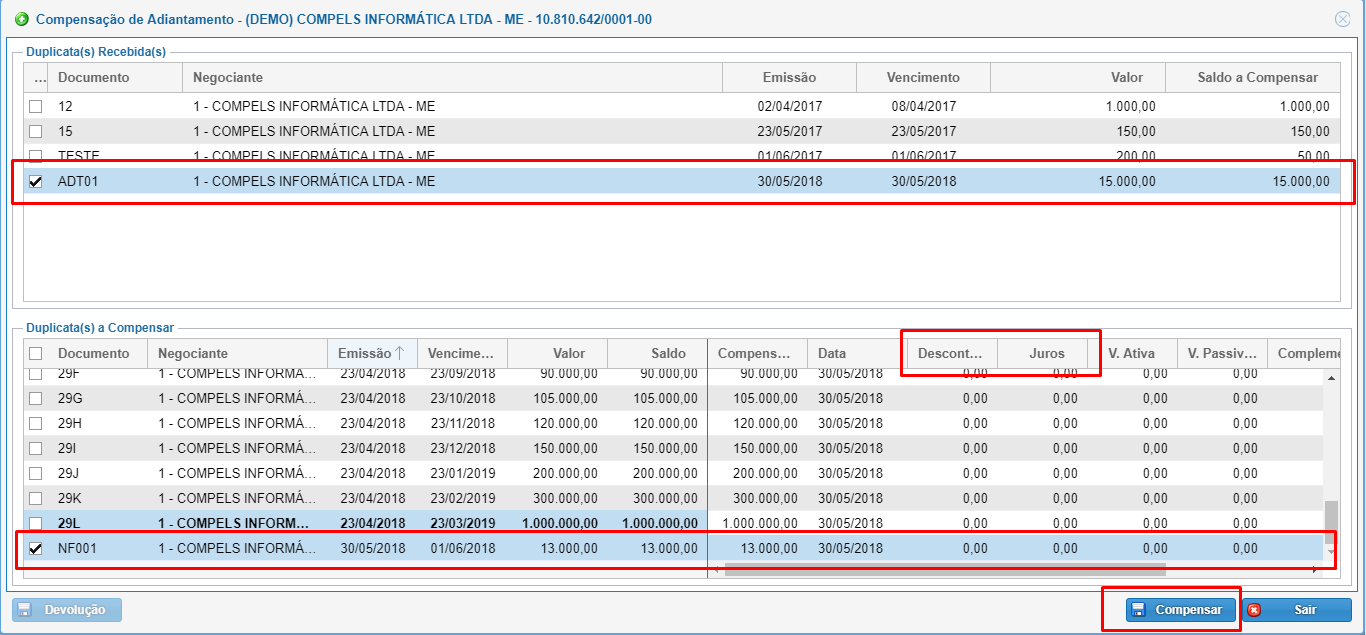 Após a seleção nas duas tabelas, pode-se ainda informar os valores de juros/desconto antes de clicar em compensar.