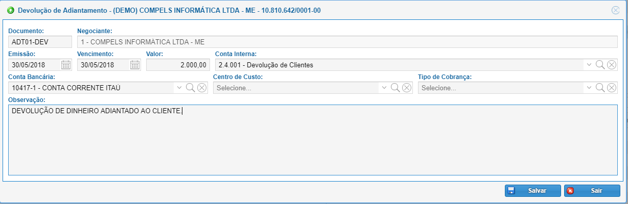 Esta tela irá realizar um lançamento de saída no caixa, para isso preencha os dados acima conforme a devolução efetuada, e clique em salvar.