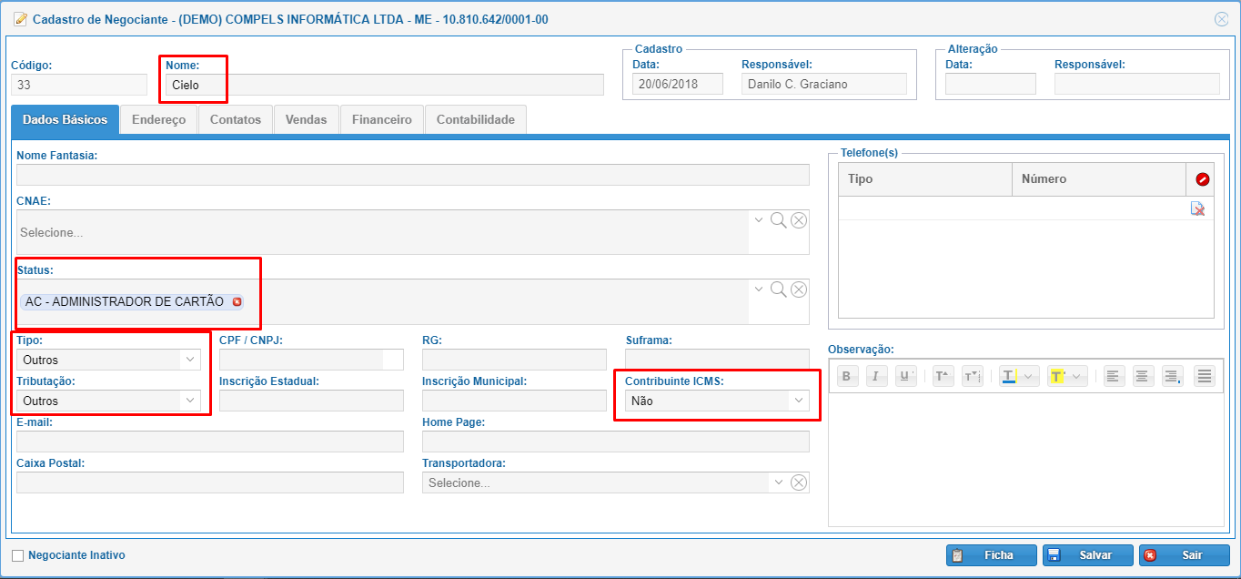 O Cadastro das administradoras de cartão deve ser feito no próprio cadastro de negociantes, informando o status Administrador de Cartão, conforme imagem abaixo: