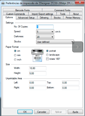É recomendado configurar a impressora Zebra ZT230 (homologada) conforme imagem abaixo, sendo possível alterar a qualidade de impressão (dark, speed, etc) de acordo com a necessidade de cada usuário.