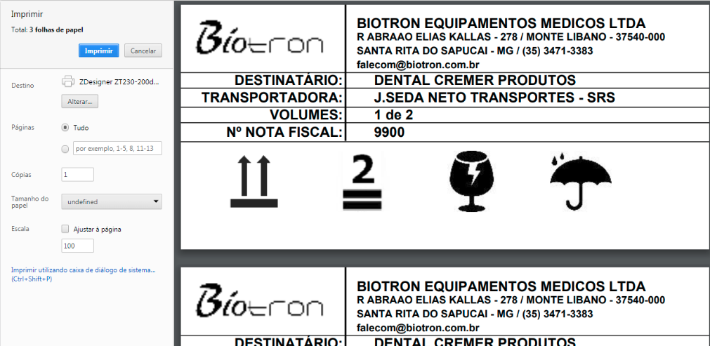 É recomendado realizar a impressão pelo navegador Google Chrome, com configuração conforme abaixo.