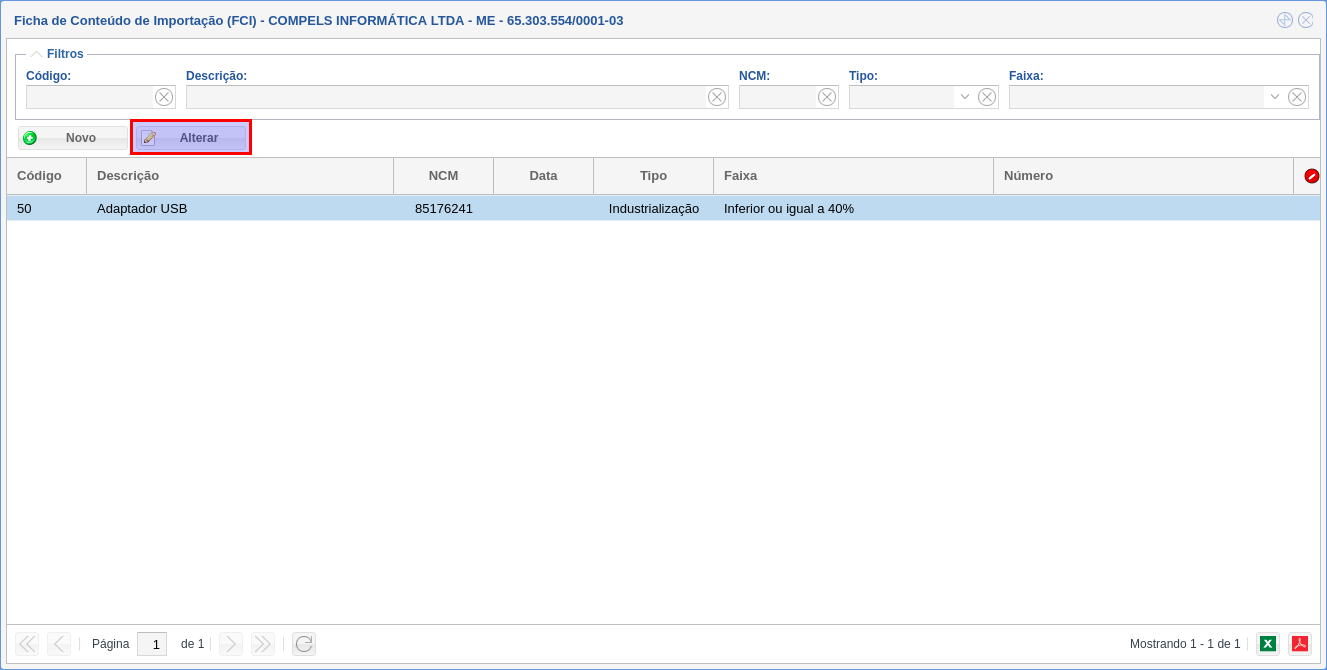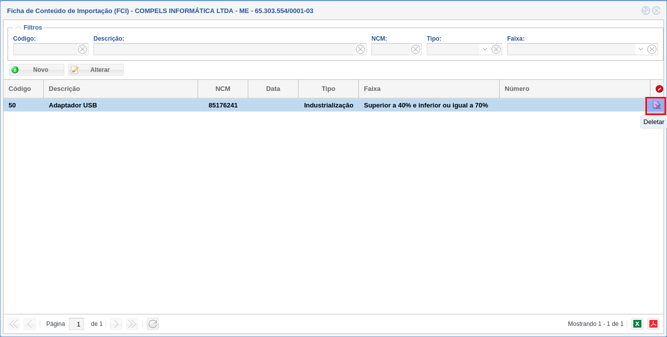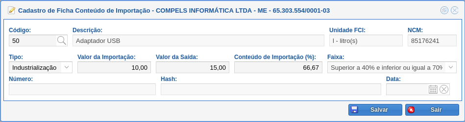 O intuito desse cadastro é determinar a porcentagem do conteúdo de importação, bem como a porcentagem da faixa.