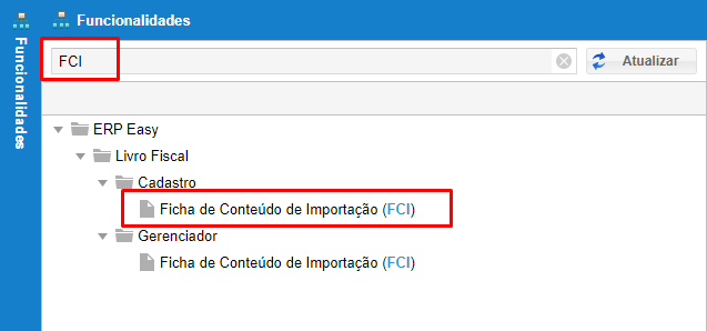 Para adicionar, alterar ou remover FCI's (Ficha de Conteúdo de Importação), acesse "FCI" ou Ficha de Conteúdo de Importação" no filtro de funcionalidades.
