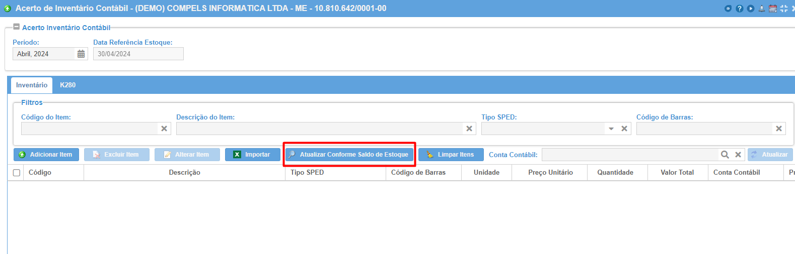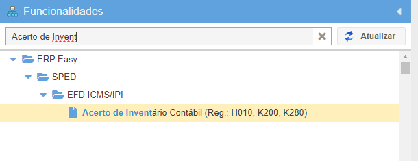 Nele são informados os registros do Bloco K e do Bloco H, ambos no Sped Fiscal ICMS/IPI. Nas Funcionalidades, filtre e escolhe a opção "Acerto de Inventário Contábil (Reg.: H010, K200, K280)".