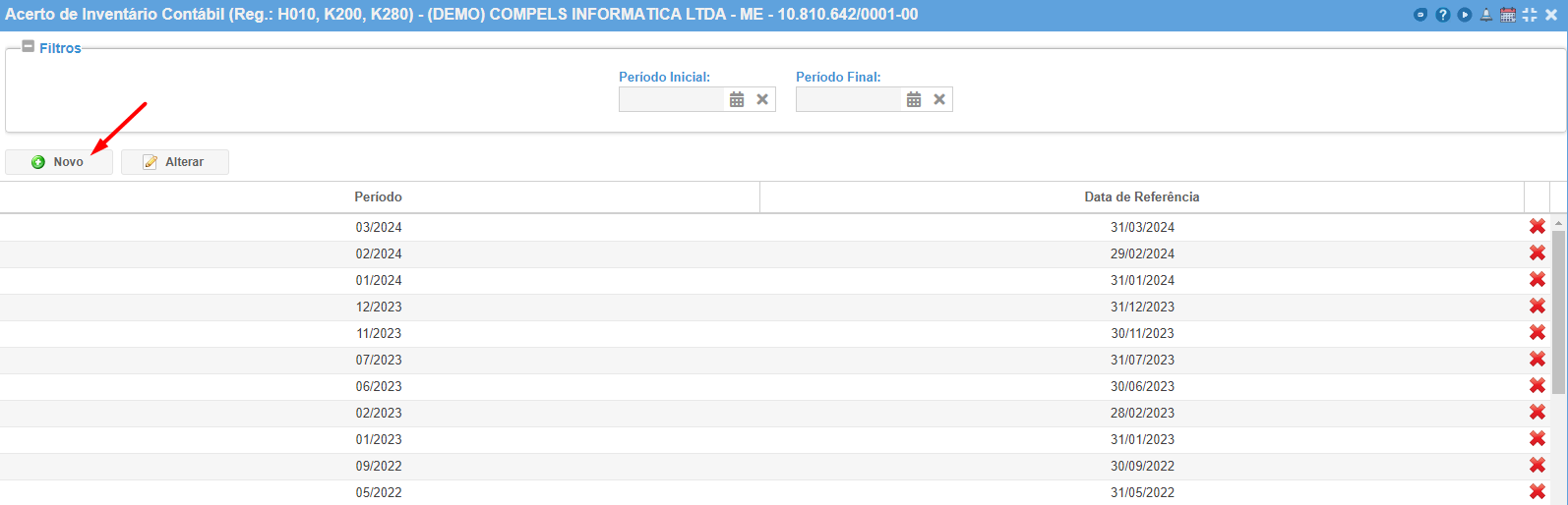 Aparecerá a tela abaixo. Clique no botão NOVO para iniciar um novo inventário.