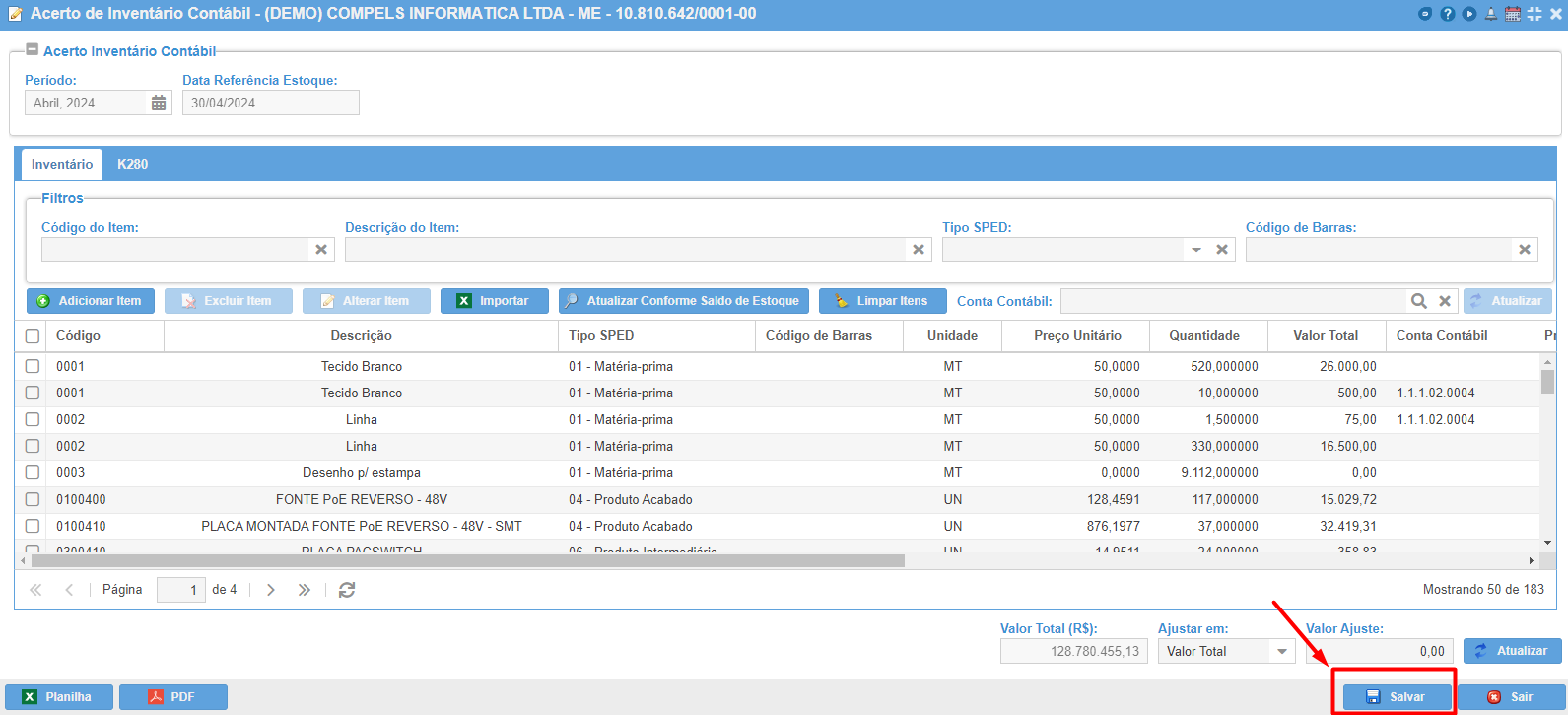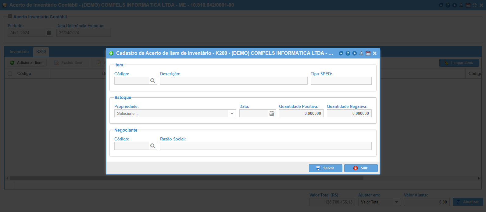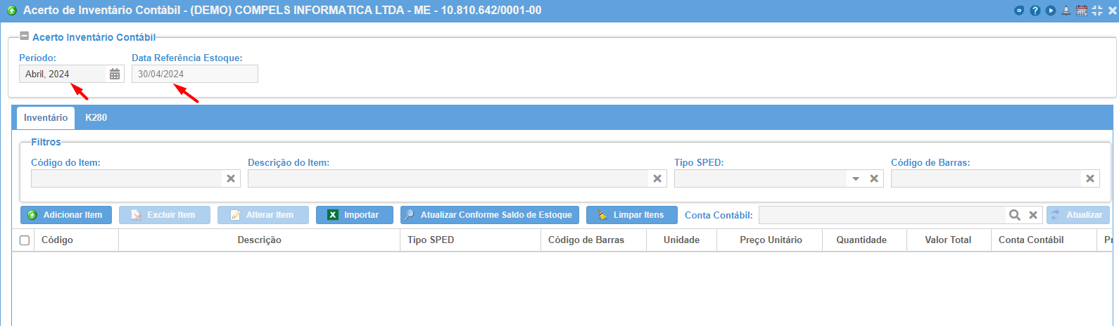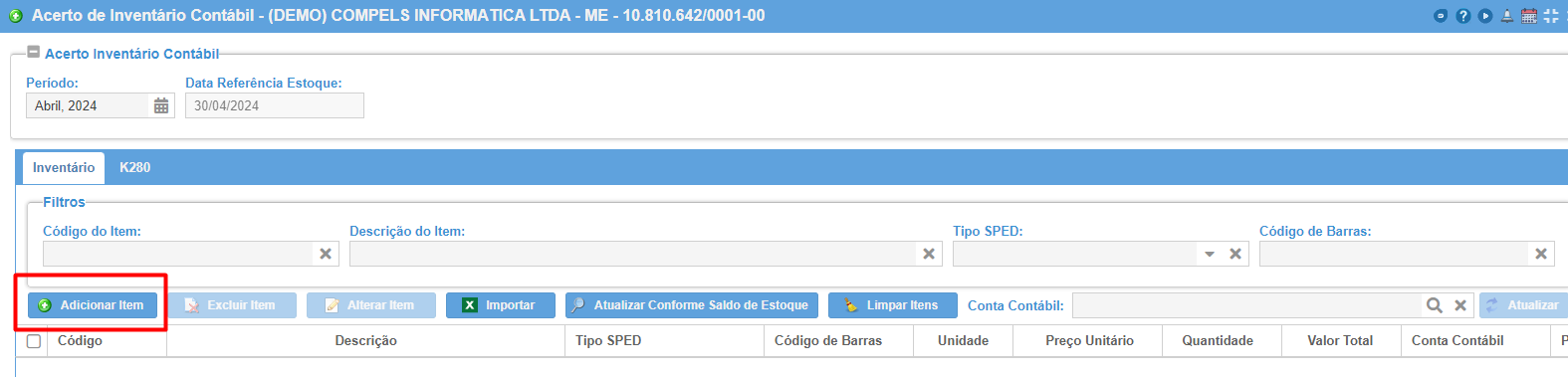 O Acerto de Inventário Contábil tem por objetivo informar o inventário físico do estabelecimento, nos casos e prazos previstos na legislação.