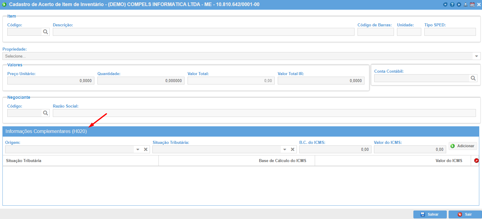 Nesta tela também é possível inserir as informações complementares referente ao Bloco H020.