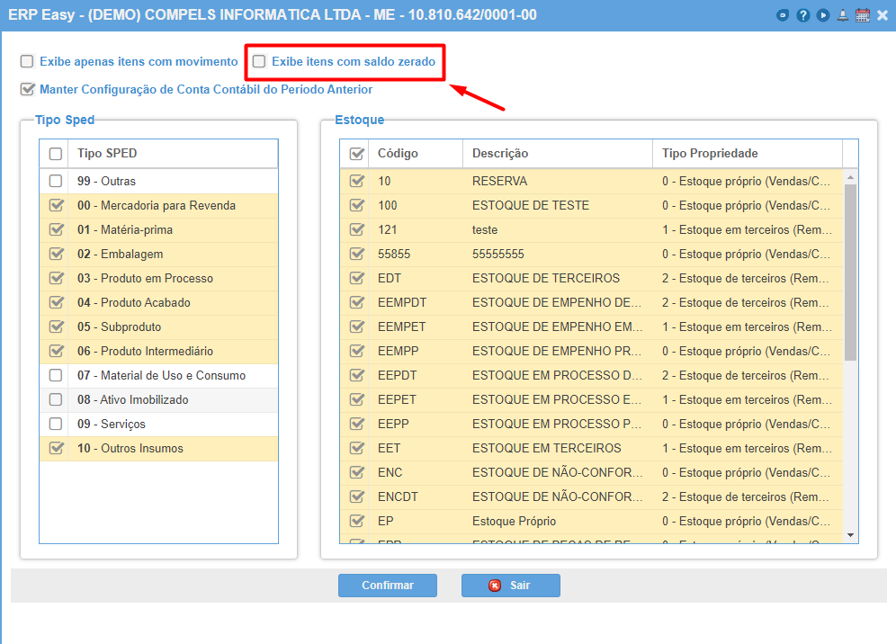 Se optar por informar também os itens que não possuem saldo em estoque no periodo de referencia, selecione a opção "Exibe itens com saldo zerado".